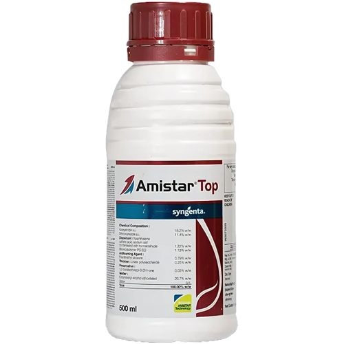 Amistar Top is a broad-spectrum foliar fungicide combining two active ingredients Azoxystrobin and Difenoconazole to deliver preventive, curative, and systemic control of major fungal diseases in maize, French beans, snow peas, and roses. It effectively manages Grey Leaf Spot, Leaf Blight, Common Rust, and a range of leaf spots and powdery mildew, helping farmers protect yield, quality, and crop vigor.