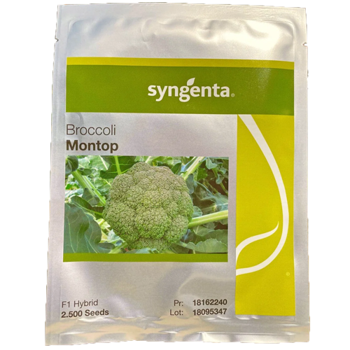 Broccoli Montop F1 is a medium-early hybrid broccoli variety developed by Syngenta for open-field production, targeting both fresh market and processing. It is a vigorous, uniform variety that produces dark green, dome-shaped heads with fine beads, ideal for premium market presentation and punnet packing.